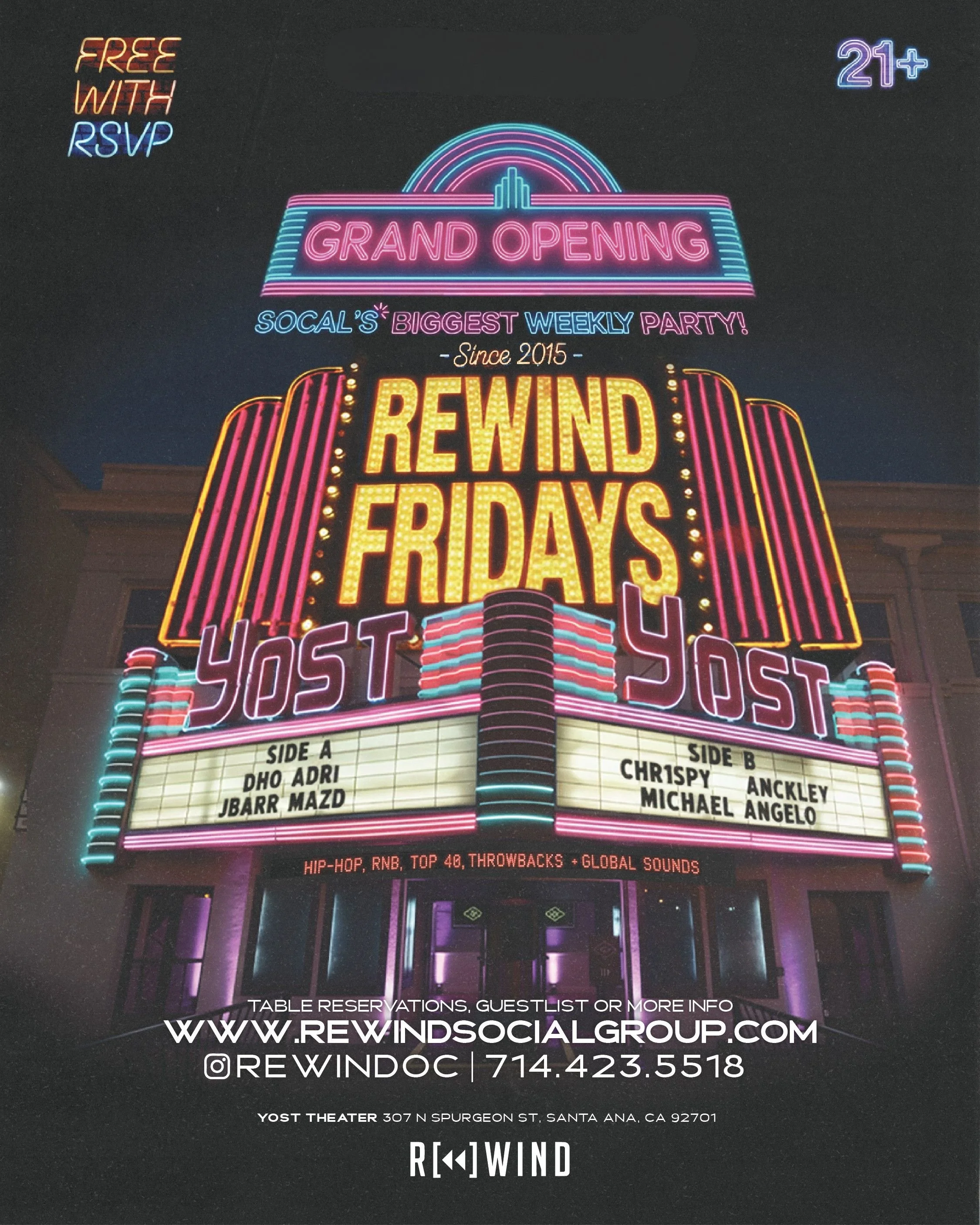 The Yost Theater Orange County number 1 night club. With space for over 1,000 party people, it’s the spot for nightlife, bottle service, and weekend takeovers. Tired of small, sweaty clubs with no AC? We’ve got a massive space with full-blast air conditioning to keep you cool while the party heats up. Feel the drop with 45,000 watts of bass, a 20-foot LED wall, club-style lasers, and next-level lighting. Enjoy three fully stocked bars, an outdoor smoking patio, and premium VIP sections with the best views. All inside a historic venue flipped into OC’s ultimate nightlife set up.