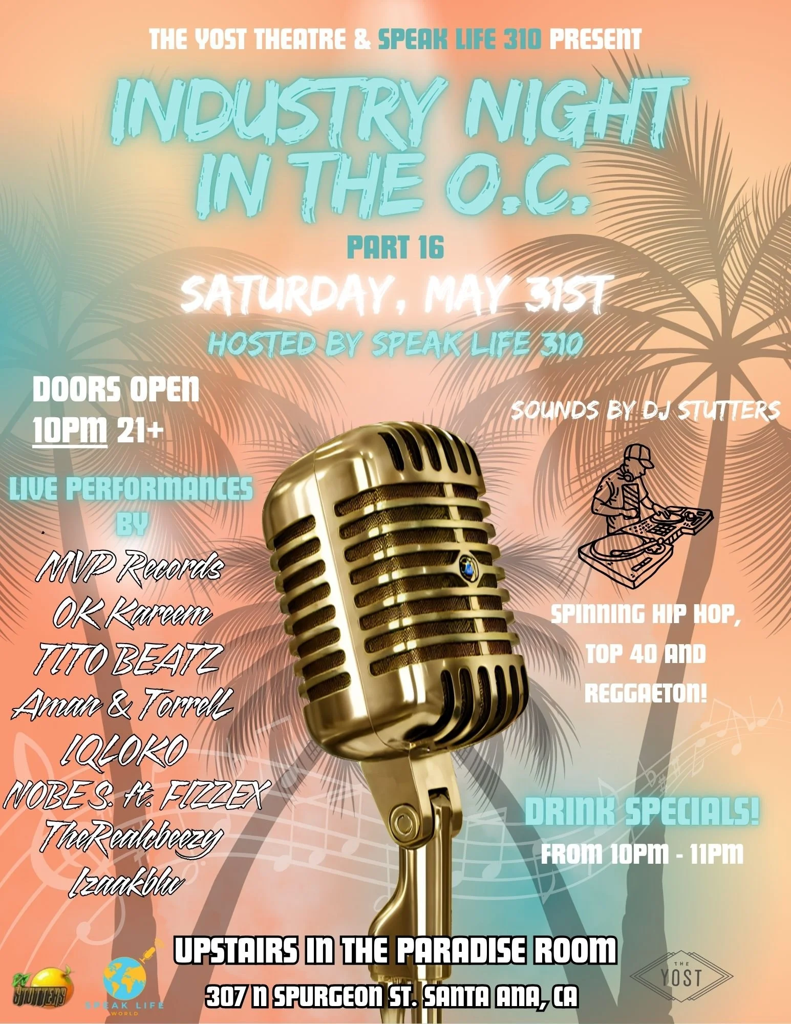 THIS SATURDAY NIGHT! COME EXPERIENCE AN INTIMATE NIGHT TO REMEMBER FILLED WITH DJ STUTTERS SPINNING HIP HOP, TOP 40 & REGGAETON MUSIC! WE WILL ALSO HAVE PHOTOGRAPHERS, VIDEOGRAPHERS, MODELS, EXOTIC DRINKS, GOOD VIBES AND OF COURSE... LIVE PERFORMANCES BY SOME OF THE MOST LIT UNSIGNED MUSIC ARTISTS IN SOUTHERN CALI! ITS ABOUT TO BE AN EXPERIENCE!